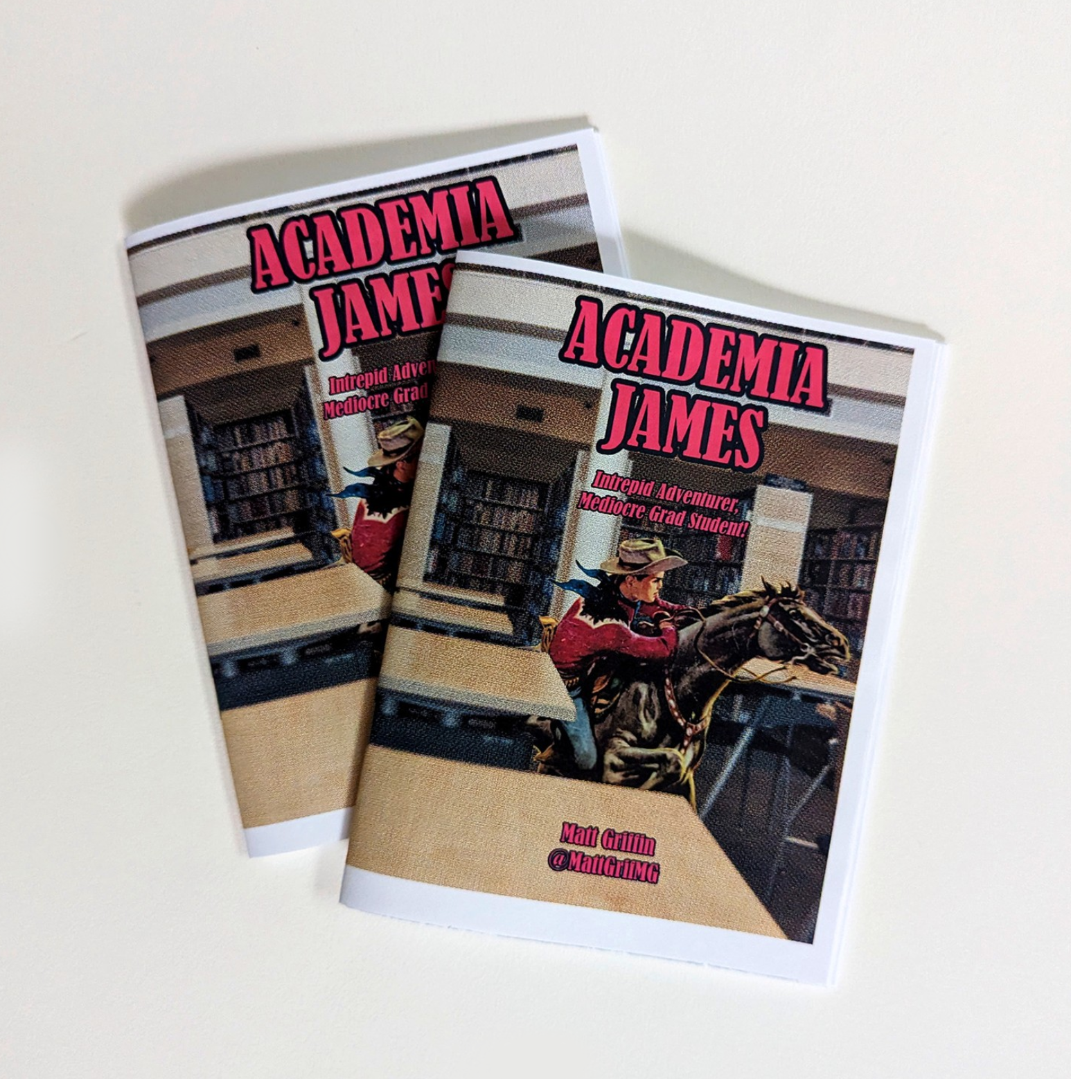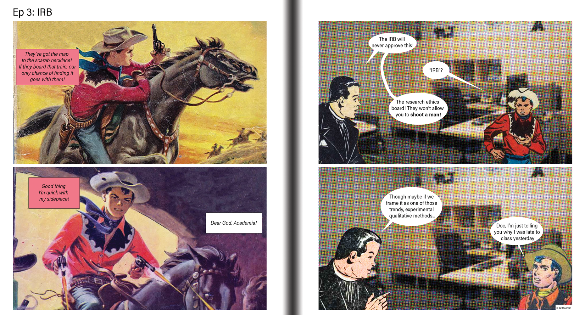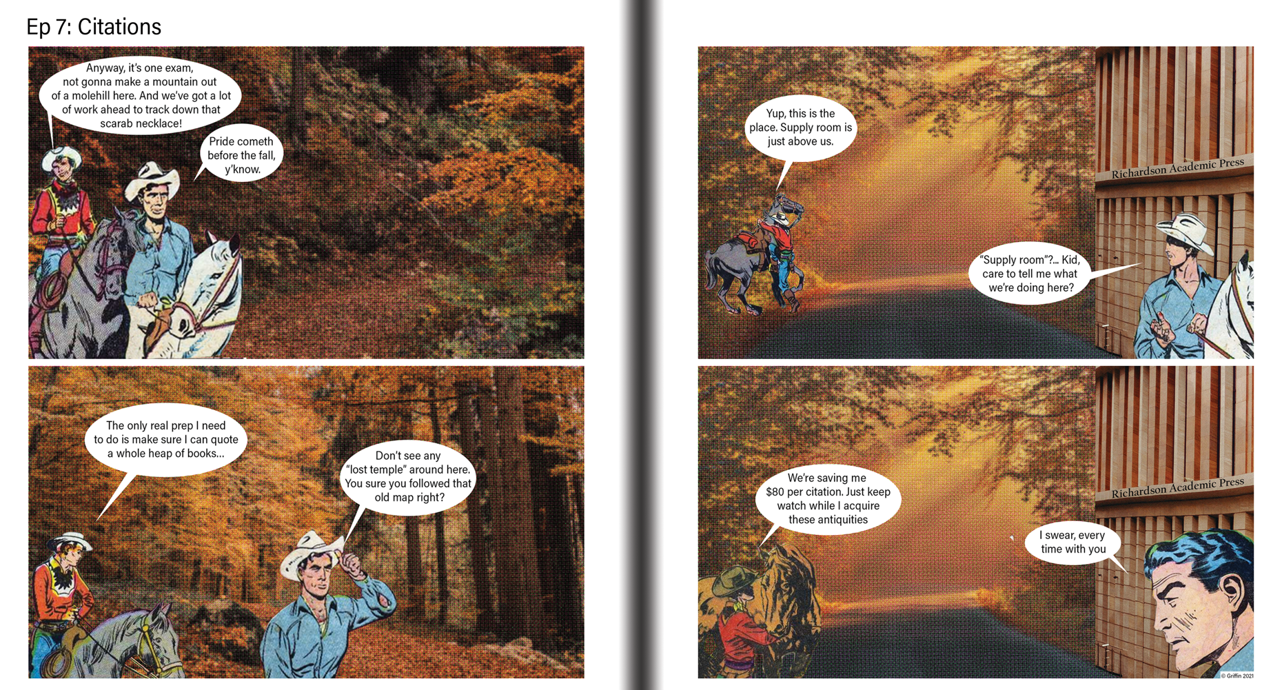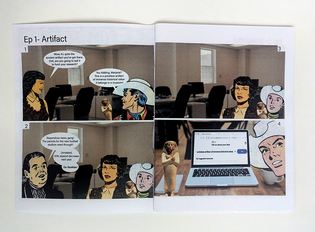 Intrepid adventurer, mediocre grad student! A 54-page collection of 4-panel comic strips that satirize grad school, adventure movies, capitalism, and everything in-between. Made using public domain comic art and photographs. By Matt Griffin.