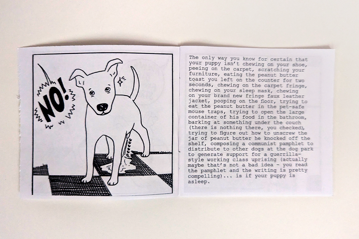 A 28-page zine about the trials, tribulations, and adorable situations that inevitably occur when one adopts a puppy. Inspired by the life of Spooky the Dog. By Anna Reishus.