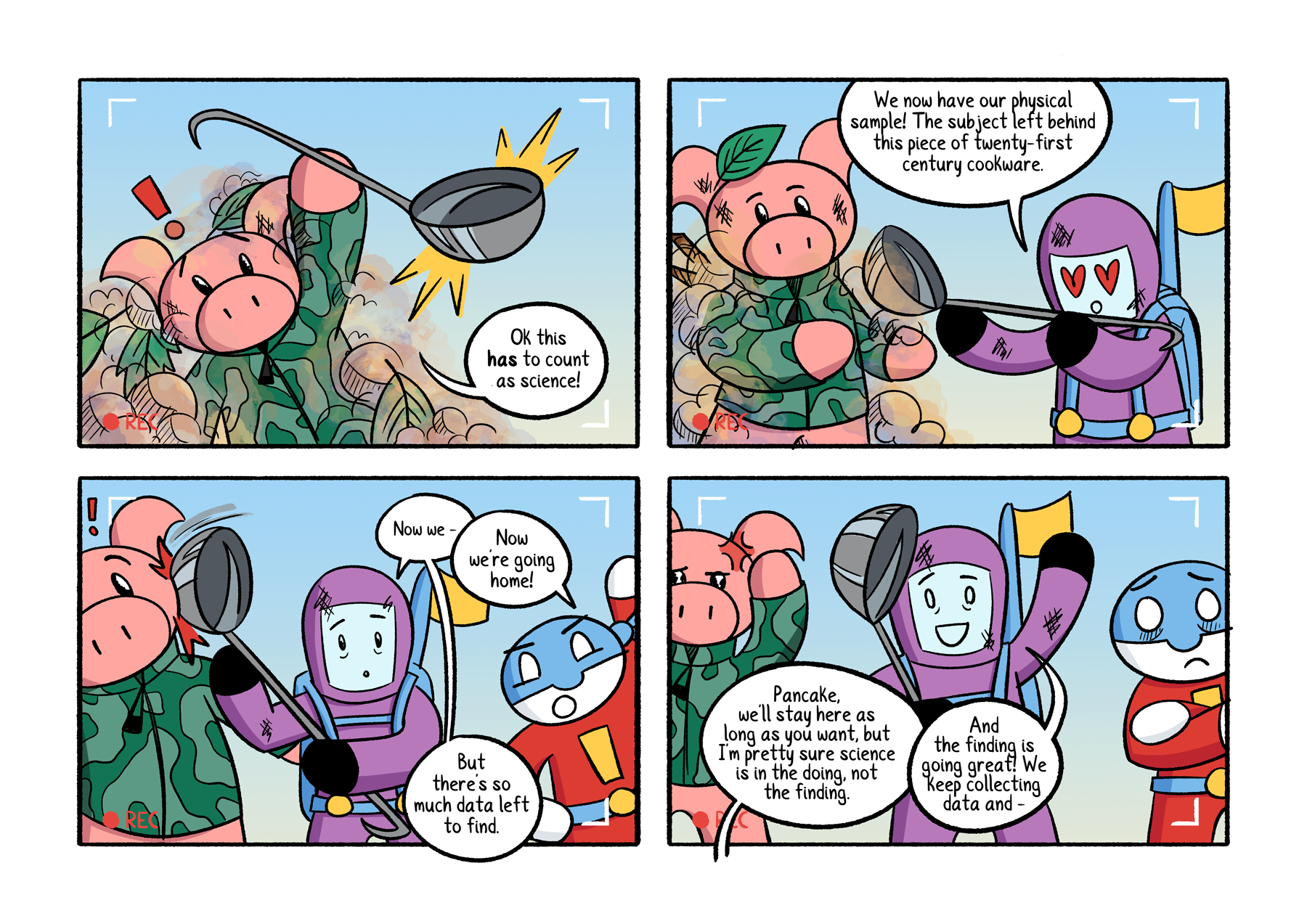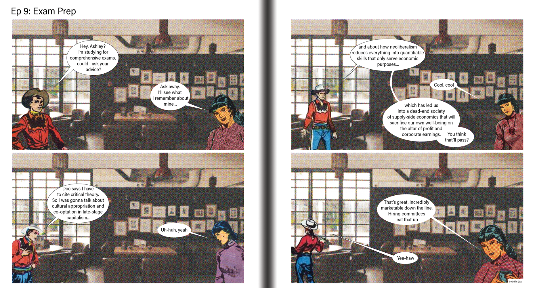 Intrepid adventurer, mediocre grad student! A 54-page collection of 4-panel comic strips that satirize grad school, adventure movies, capitalism, and everything in-between. Made using public domain comic art and photographs. By Matt Griffin.