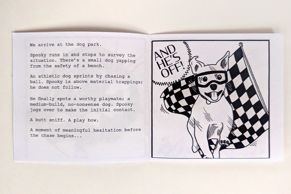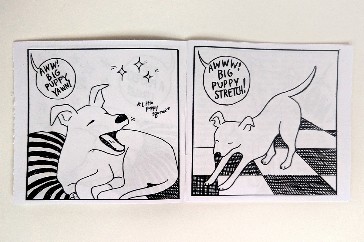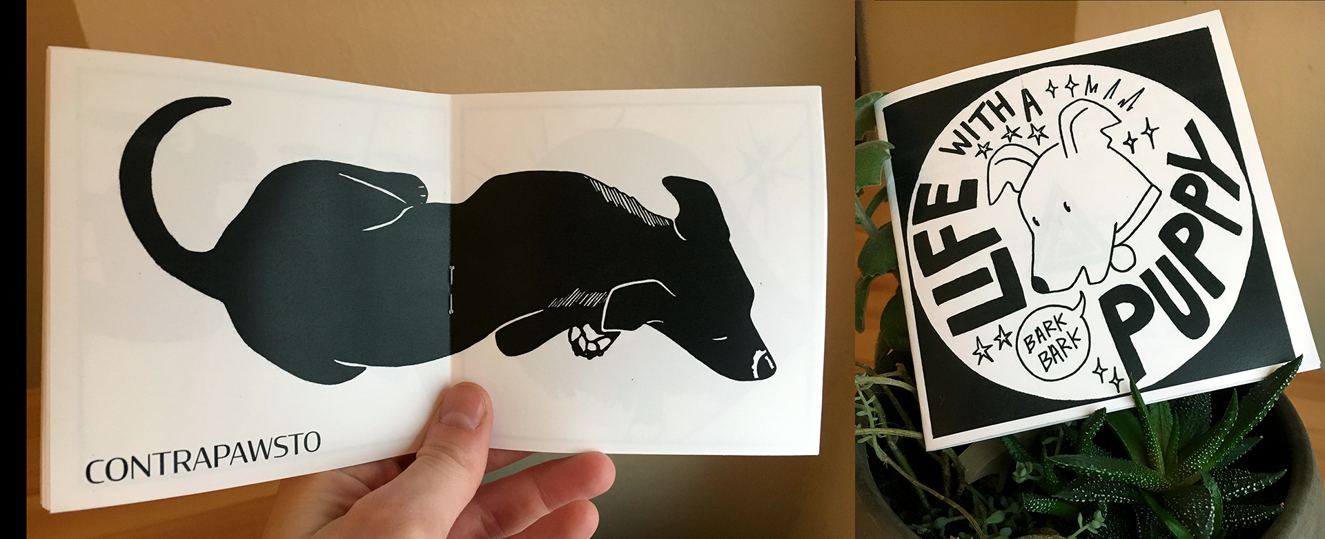 A 28-page zine about the trials, tribulations, and adorable situations that inevitably occur when one adopts a puppy. Inspired by the life of Spooky the Dog. By Anna Reishus.